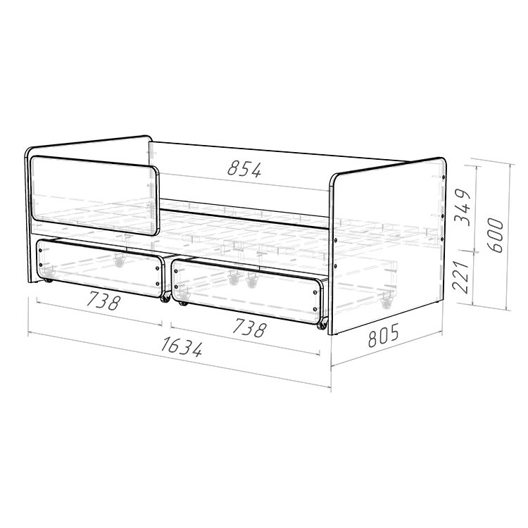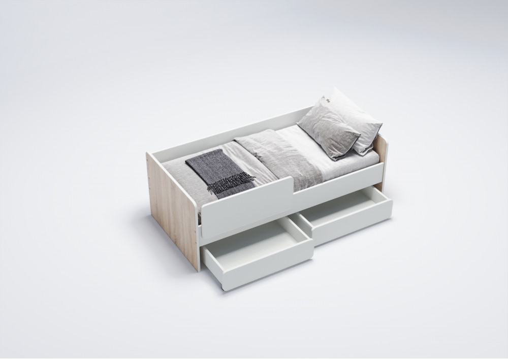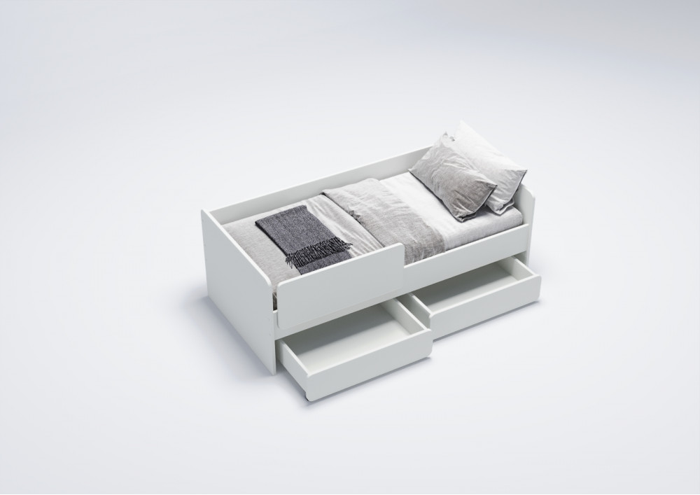 Основное внимание при проектировании данной кровати уделяется безопасности ребенка. Съемный бортик безопасности может быть установлен в любом месте или просто убран в зависимости от потребностей. Отсутствие острых углов и мягкий противоударный кант обеспечивают дополнительную защиту и безопасность во время использования кровати.