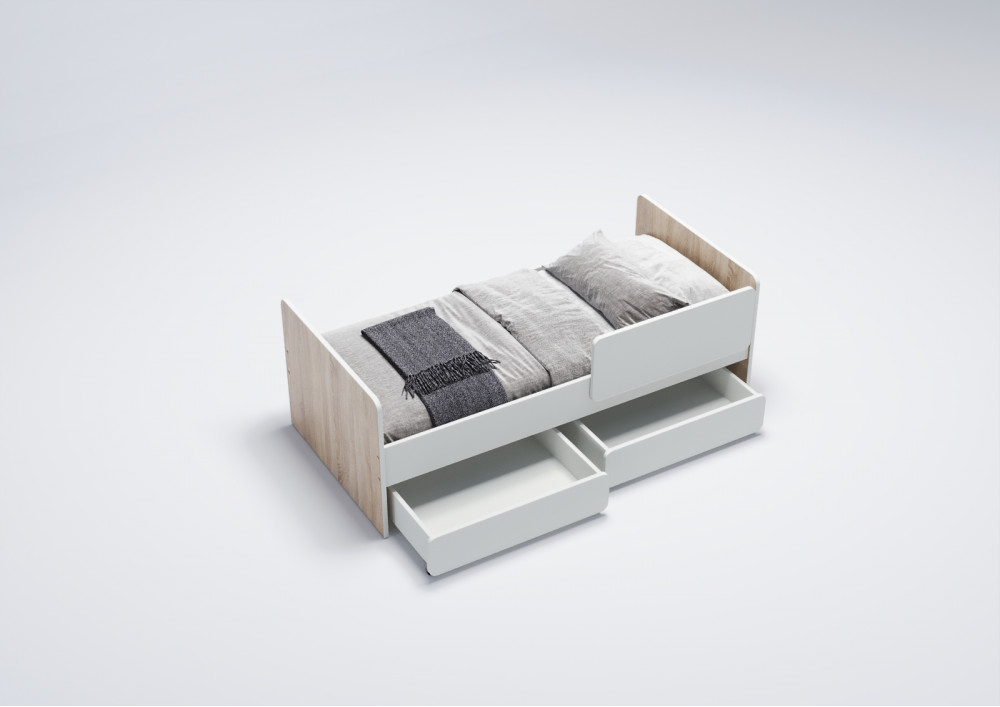 3. Выкатные ящики: Кровать оснащена двумя выкатными вместительными ящиками, которые оборудованы прямоходными колесами для легкости использования. Это удобное решение для хранения игрушек, постельного белья или других вещей.